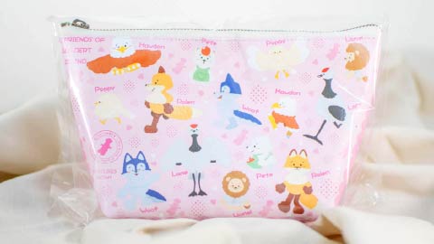 ポピィ、ホードン、ローレン、ピート、ウーフ、レイン、ライオネルを賑やかにあしらったレザーポーチです。中地がグリーンとなっており遊び心のある一品です。